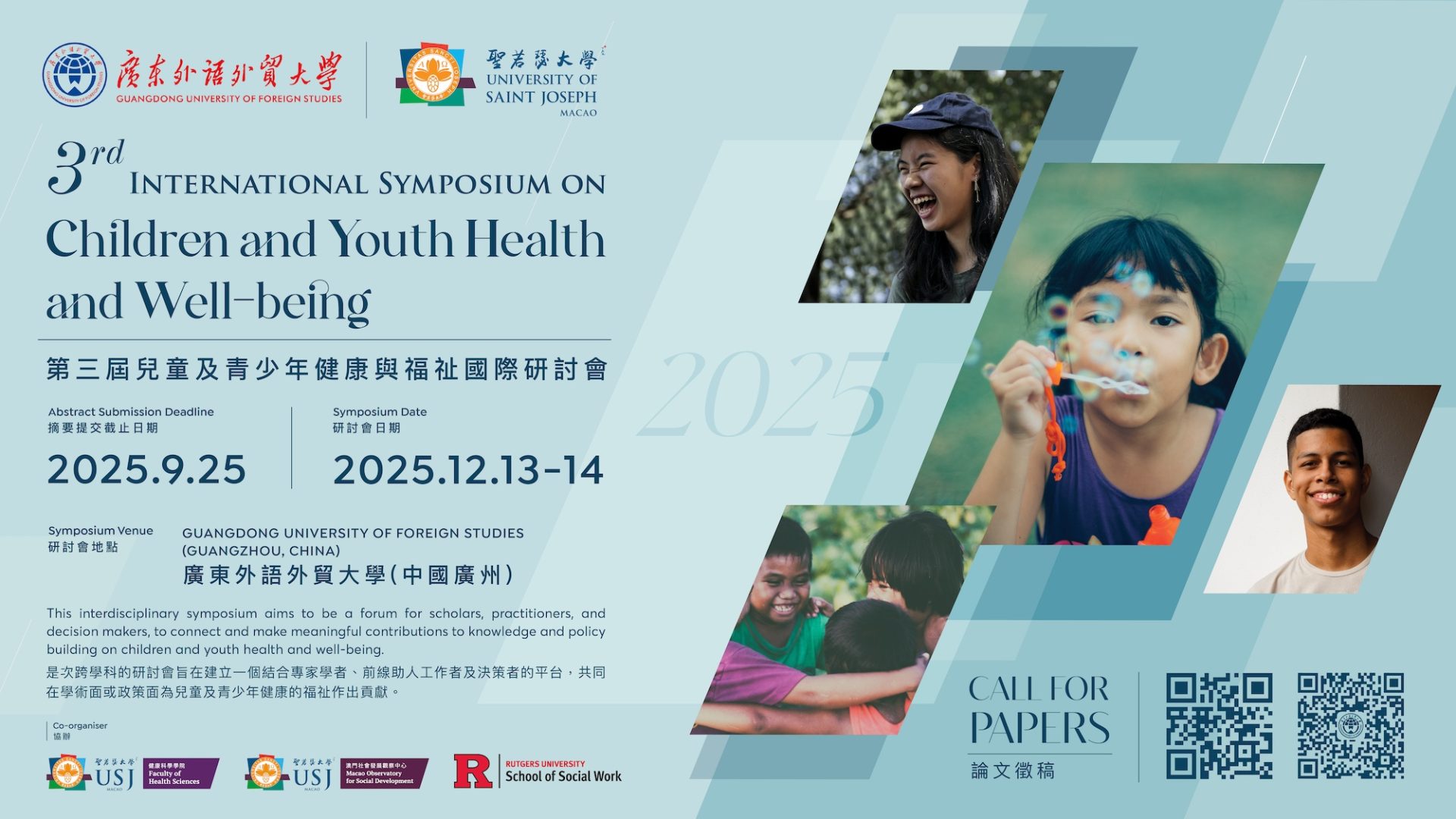 We had a great success on both the 1st and 2nd international Symposium on Children and Youth Health and Well-being held at University of Saint Joseph Macao, China. This year’s 3rd International Symposium on Children and Youth Health and Well-being will be held at Guangdong University of Foreign Studies (Guangzhou, China) on 13 – 14 December, 2025.