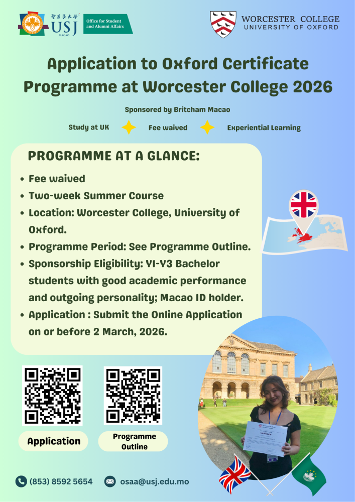 Oxford Certificate Summer Programme Scholarship available for Macao local students (including flight tickets, accommodation and programme fee)! Enquiry: Miss Jade Tan (osaa@usj.edu.mo) |