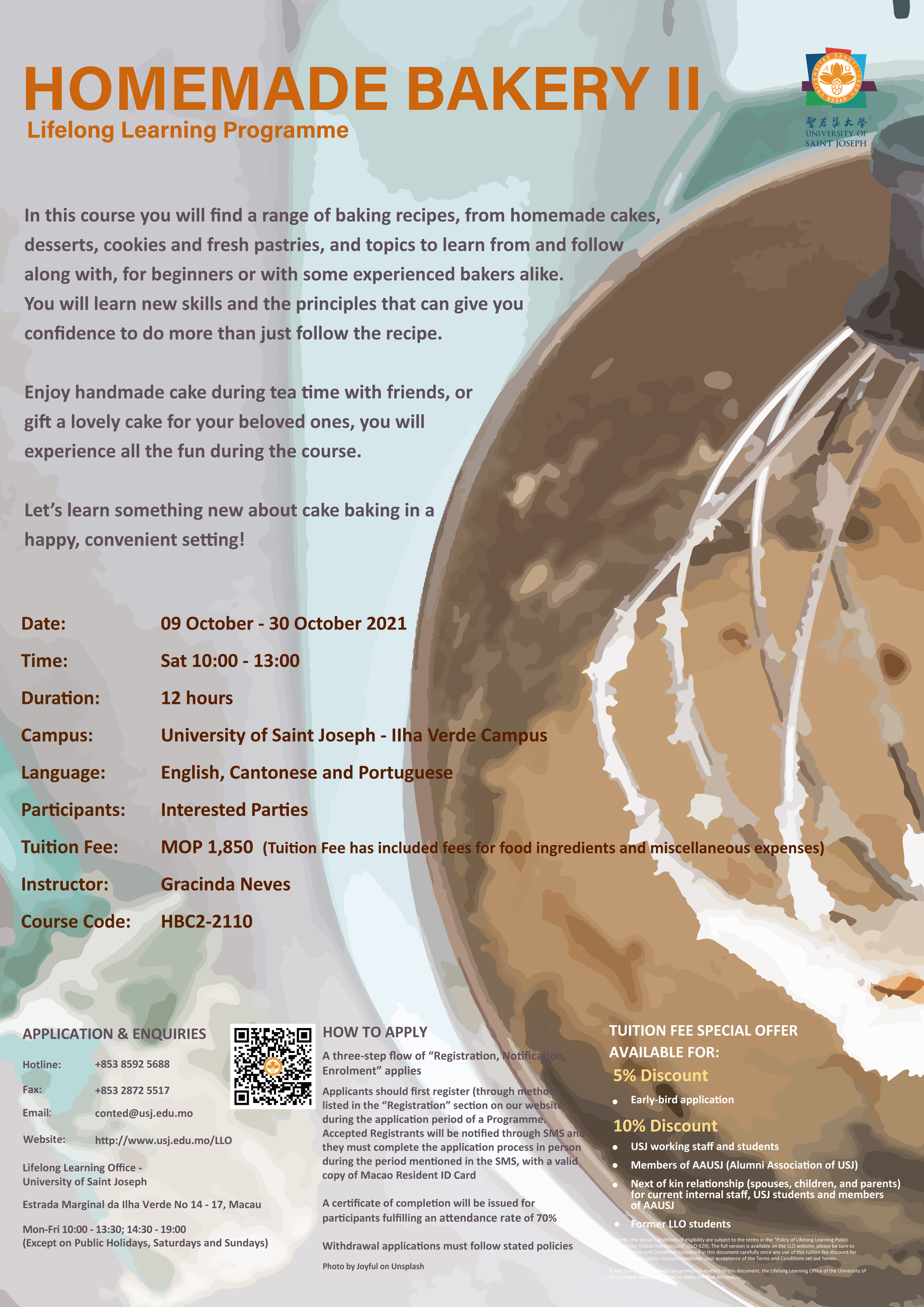 Remarks: the above Conditions of eligibility are subject to the terms in the “Policy of Lifelong Learning Public Programmes Tuition Fee Discount” (LLO-529). The full version is available on the LLO website (click here), please be sure to read the Terms and Conditions contained in this document carefully since any use of this tuition fee discount for lifelong learning public courses constitutes your acceptance of the Terms and Conditions set out herein. In the event of any dispute concerning the matters in this document, the Lifelong Learning Office of the University of Saint Joseph reserves all rights to make the final decision.