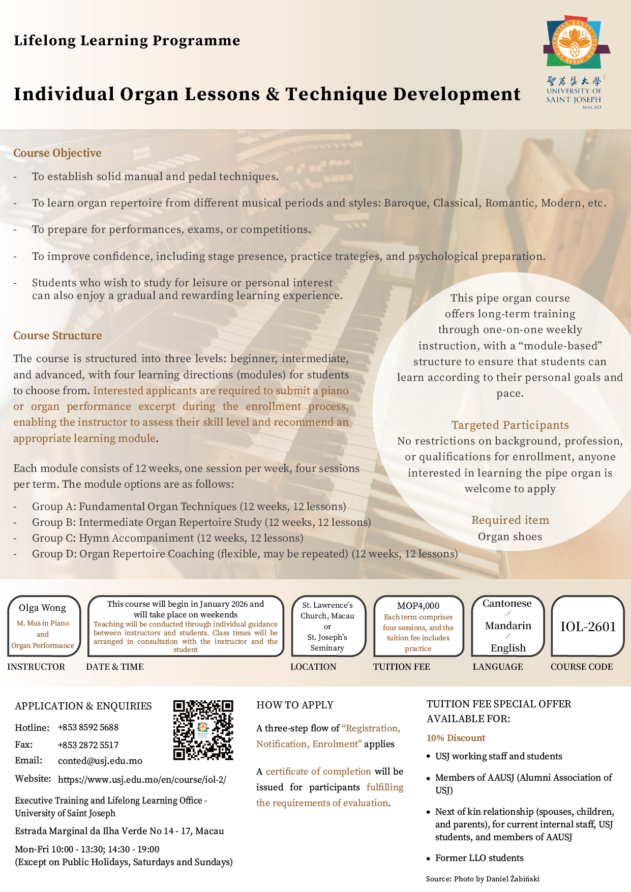 This pipe organ course offers long-term training through one-on-one weekly instruction, with a “module-based” structure to ensure that students can learn according to their personal goals and pace. Each module consists of 12 weeks, with personalized learning objectives and weekly course assignments. Students may enroll continuously or intermittently depending on their needs. There are no restrictions on background, profession, or qualifications for enrollment, anyone interested in learning the pipe organ is welcome to apply.