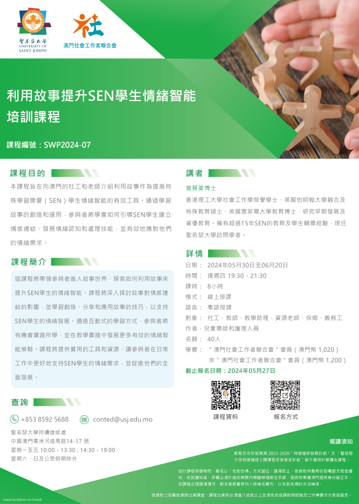 2024年度「聖若瑟大學與澳門社會工作者聯合會合辦課程」報名安排將以「先登記,後通知,再報名」方式進行。
