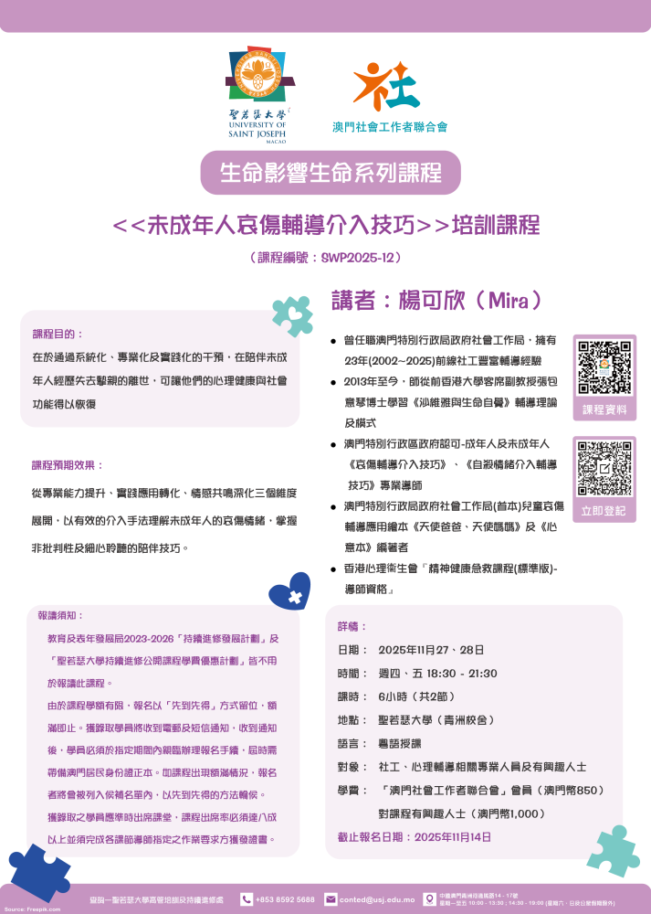 - 報名詳情,請按此瀏覽(資料以2025年度「聖若瑟大學與澳門社會工作者聯合會合辦課程」—資訊欄 > 報名方式所列之資料為準)。