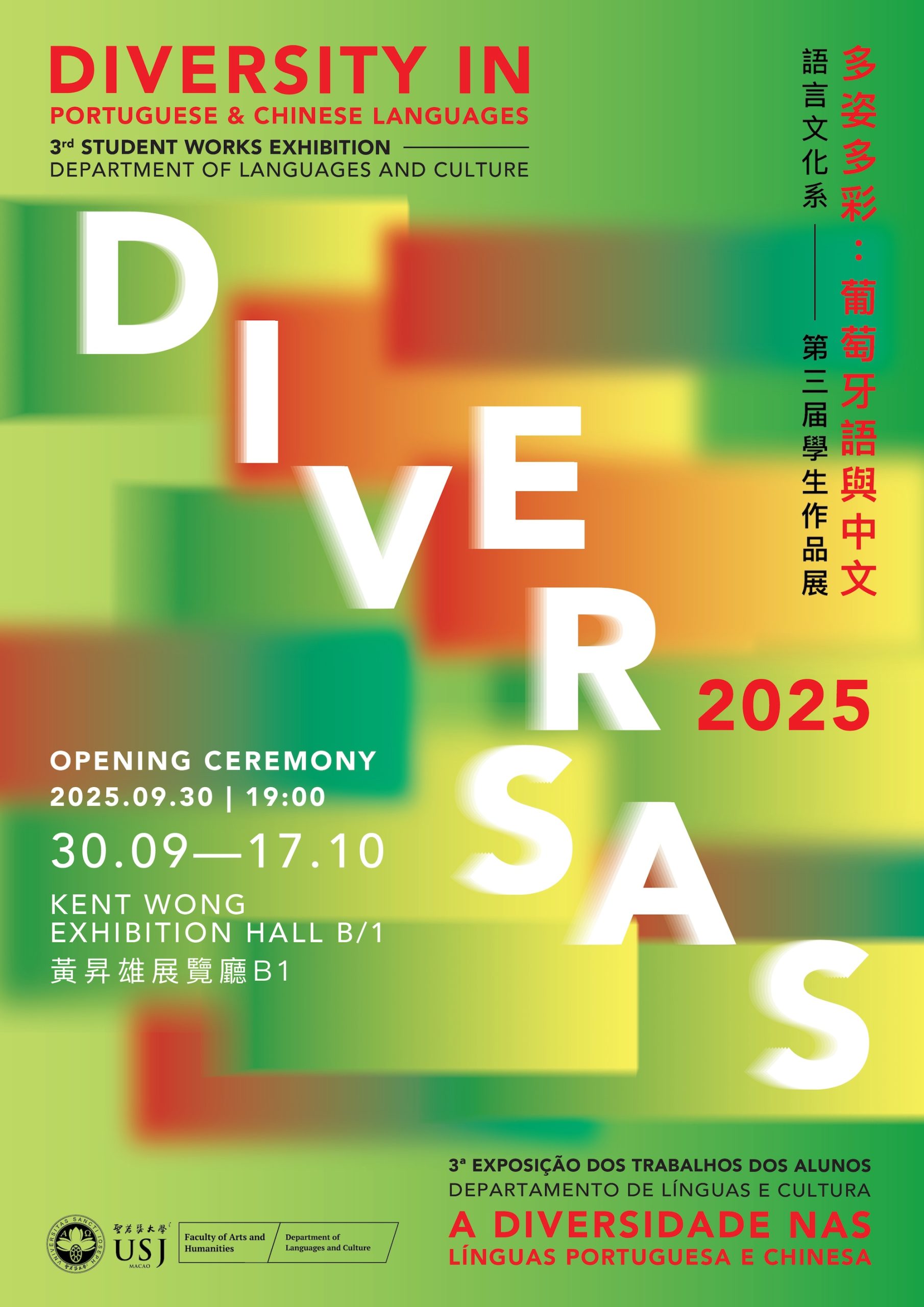 Organizada em parceria com o Departamento de Arquitetura e Design, a exposição “DIVERSAS – A Diversidade nas Línguas Portuguesa e Chinesa” exibirá projetos desenvolvidos pelos alunos da Licenciatura em Estudos de Tradução Português-Chinês e por estudantes de Português das diferentes licenciaturas da USJ, durante o ano letivo de 2024-2025.