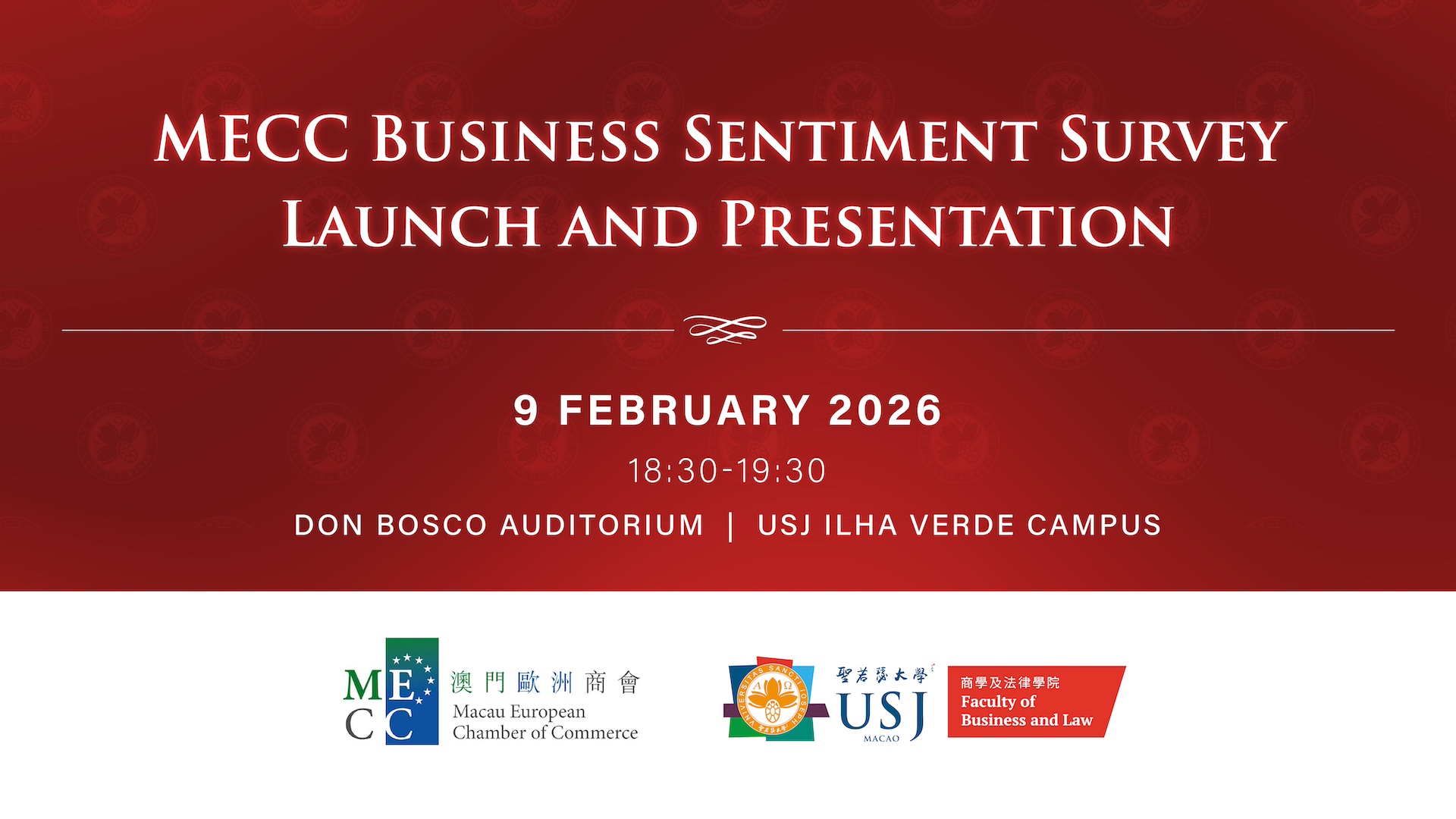 The Macau European Chamber of Commerce (MECC), in collaboration with the University of Saint Joseph’s Faculty of Business and Law (USJ-FBL), conducted a survey on Macau’s business sentiment among MECC member businesses. The result of the research will be launched with a short presentation on 9 February 2026 (Monday), fom 18:30-19:30 at the Dom Bosco Auditorium at the University of Saint Joseph.