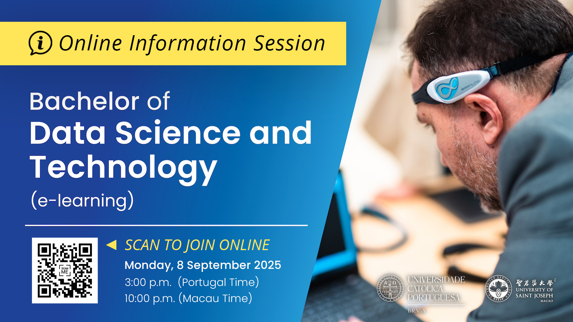 On Monday, 8 September 2025, at 10:00 p.m. (Macao Time) / 3:00 p.m. (Portugal Time), an information session will be held via Teams in English about the Data Science and Technology Bachelor degree programme at the Faculty of Philosophy and Social Sciences of the Portuguese Catholic University – Braga, which will be delivered through online distance learning (e-learning).