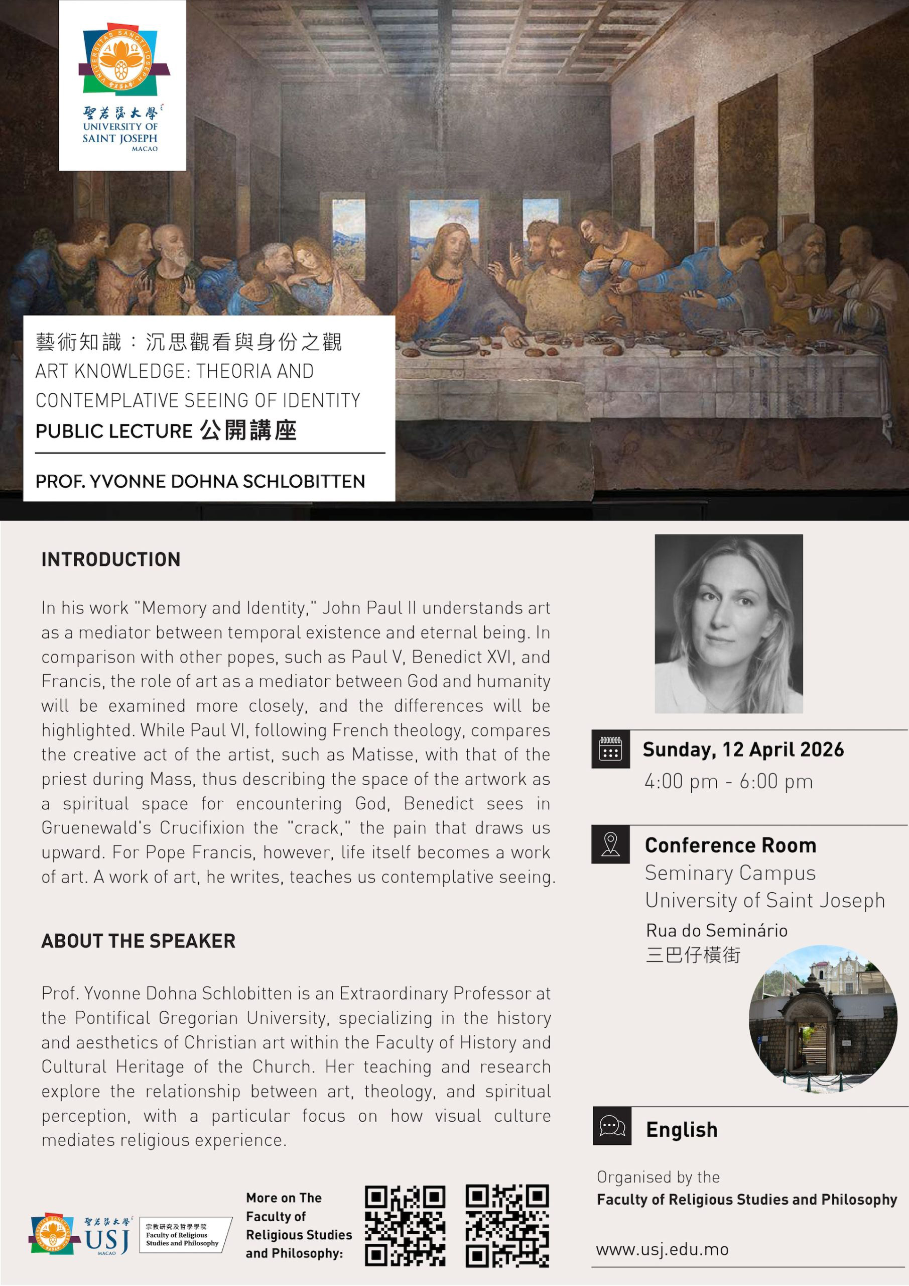 The Public Lecture “Art Knowledge: Theoria and Contemplative Seeing of Identity” by Prof. Yvonne Dohna Schlobitten, Extraordinary Professor at the Pontifical Gregorian University, will take place on Sunday, 12 April 2026, from 4 – 6pm at the Seminary Campus.