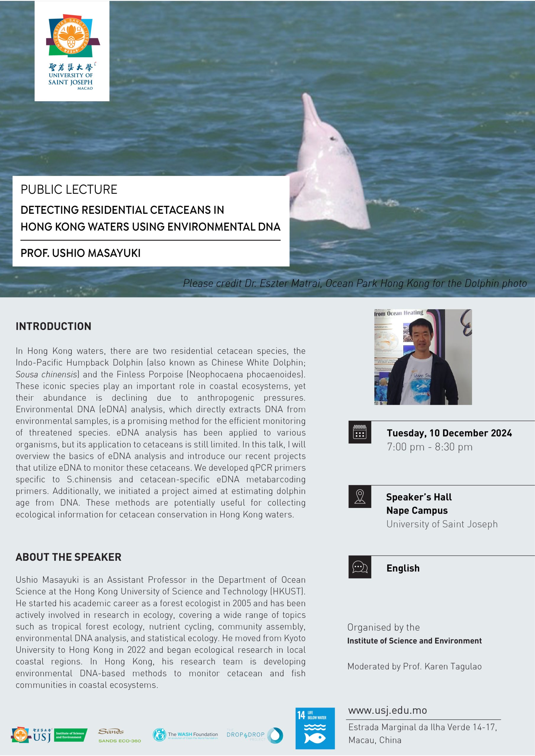 The Public Lecture “Detecting residential cetaceans in Hong Kong waters using environmental DNA”, will take place on December 10 at Nape Campus.