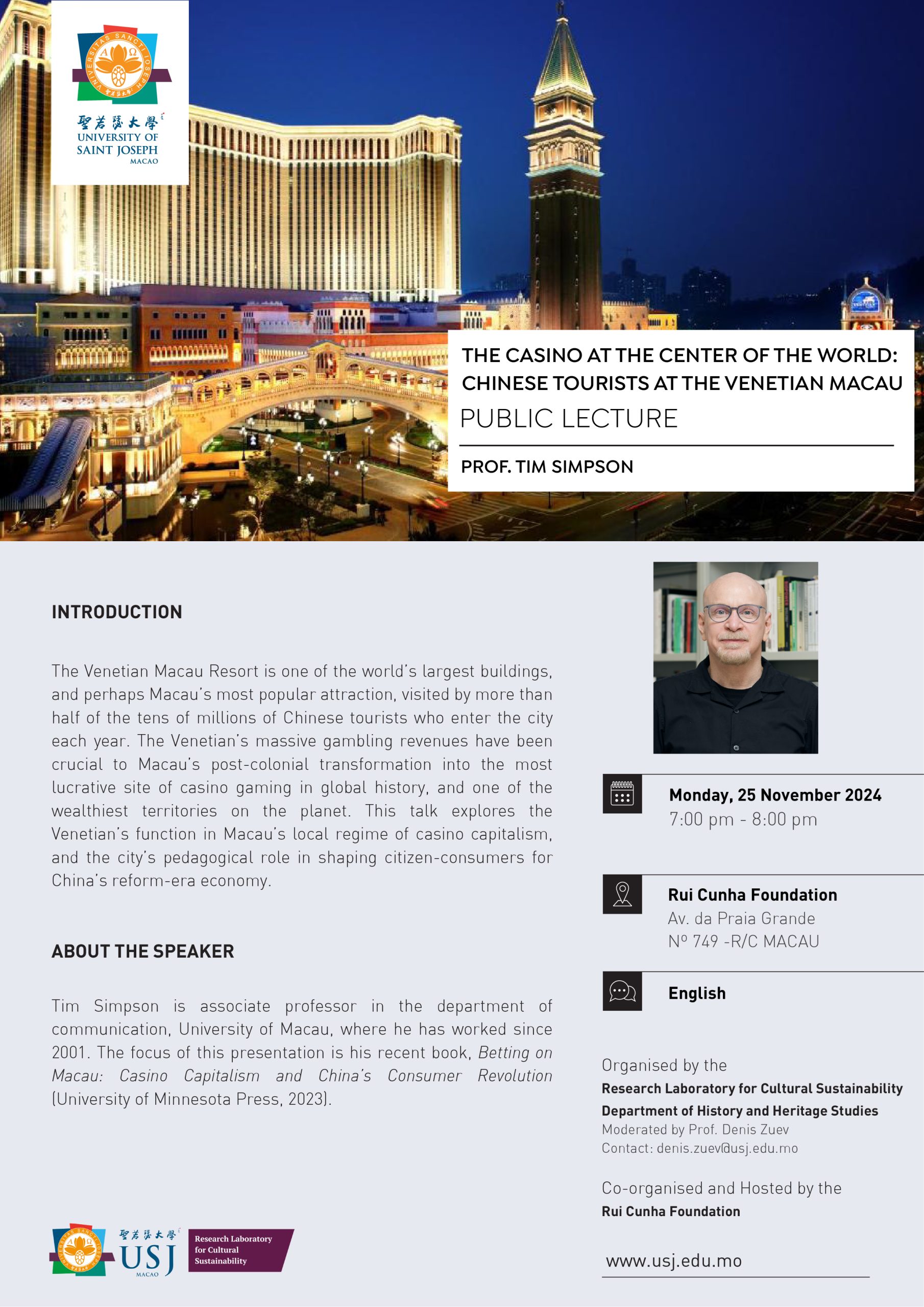 Tim Simpson is associate professor in the department of communication, University of Macau, where he has worked since 2001. The focus of this presentation is his recent book, Betting on Macau: Casino Capitalism and China’s Consumer Revolution (University of Minnesota Press, 2023).