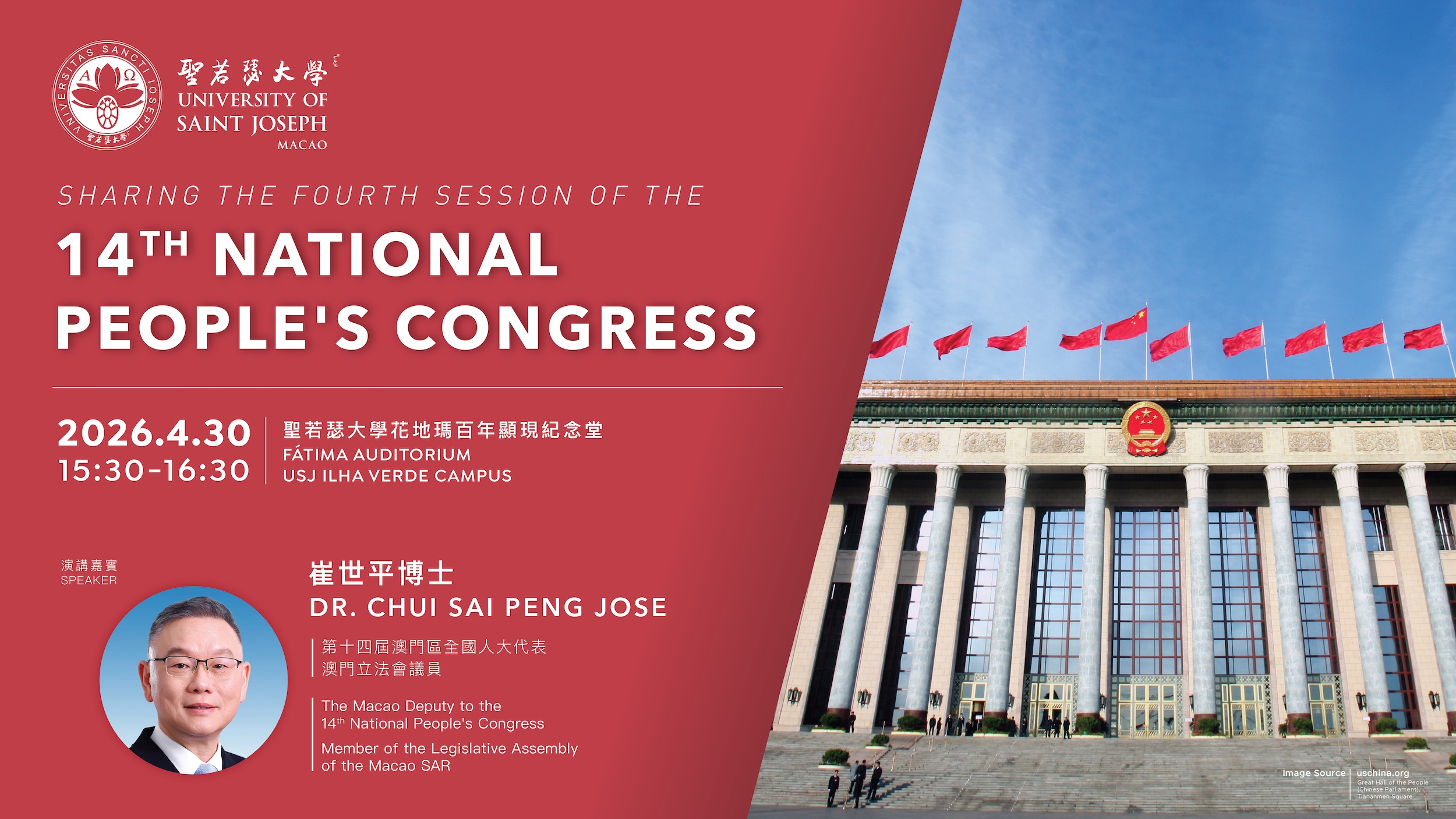 USJ welcomes Mr. Chui Sai Peng, Jose, to deliver a Sharing Session on the “15th National People’s Congress (NPC)” and the “Chinese People’s Political Consultative Conference (CPPCC)” on 30 April, from 15:30 – 16:30 art the Fátima Auditorium.