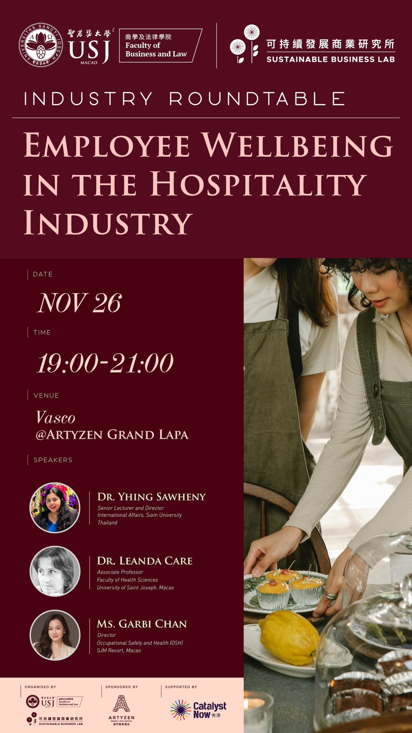 The USJ Sustainable Business Lab is proud to announce the Industry Roundtable: “Employee Wellbeing in the Hospitality Industry” featuring three talks by industry experts on Wednesday, 26 November, from 19:00 – 21:00, in Vasco@Artyzen Grand Lapa.