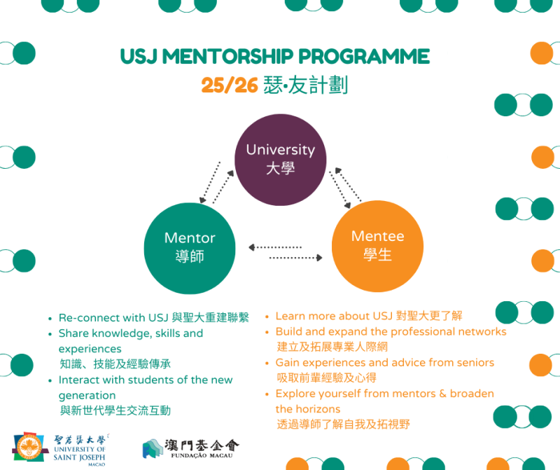 The USJ Mentorship Programme is aimed at providing a valuable opportunity for our students and young alumni to seek career advice and guidance from alumni mentors.  Our mentors are professionals or senior executives from different industries.  They will share their life experiences and stories with the mentees.