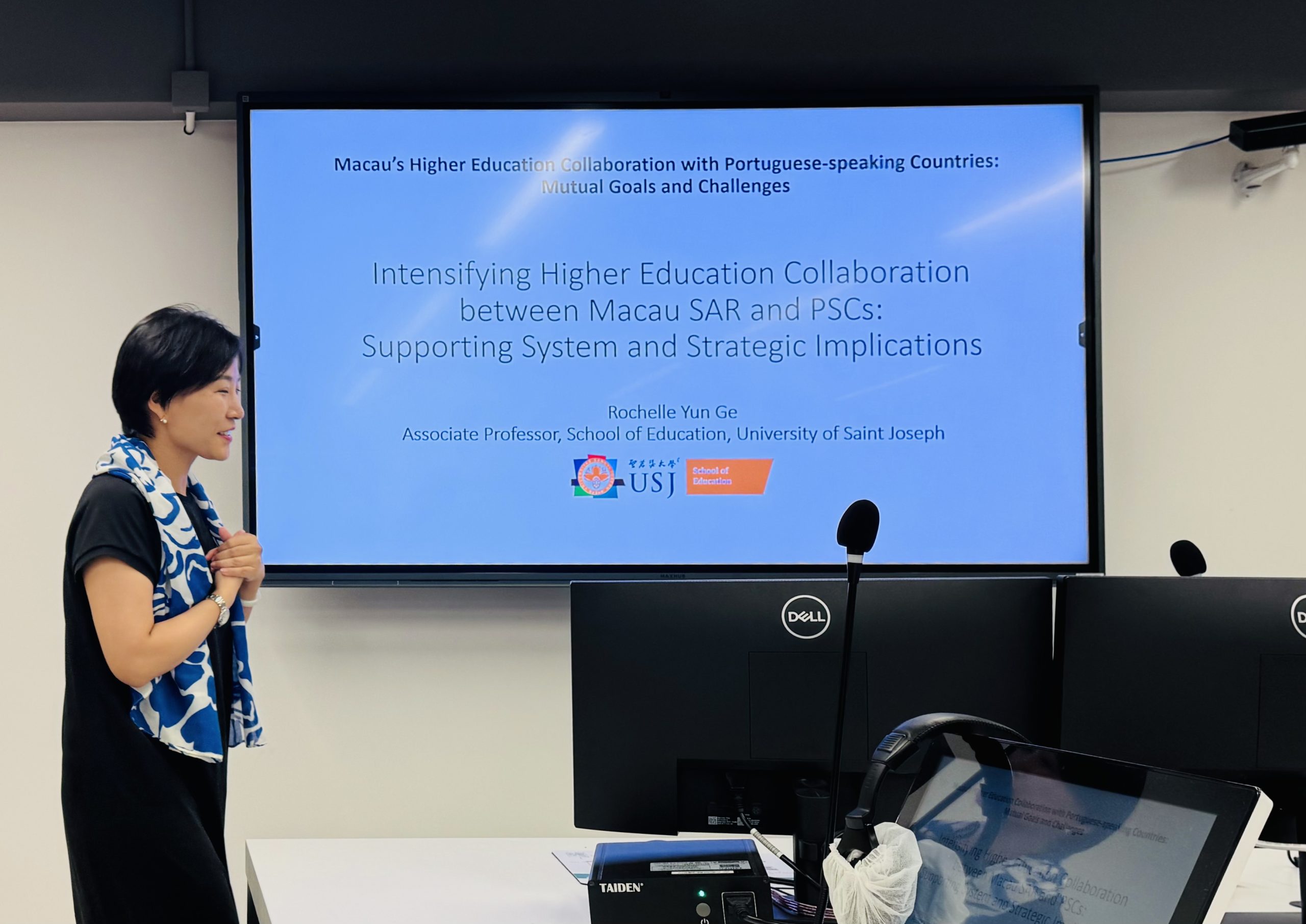 In her presentation titled Intensifying Higher Education Collaboration between Macau SAR and PSCs: Supporting System and Strategic Implications, Prof. Ge focused on the frameworks necessary for fostering academic collaboration. Prof. Ana Correia contributed with her talk, The Algorithm in the Room, exploring the significant impact of technology in the educational landscape.