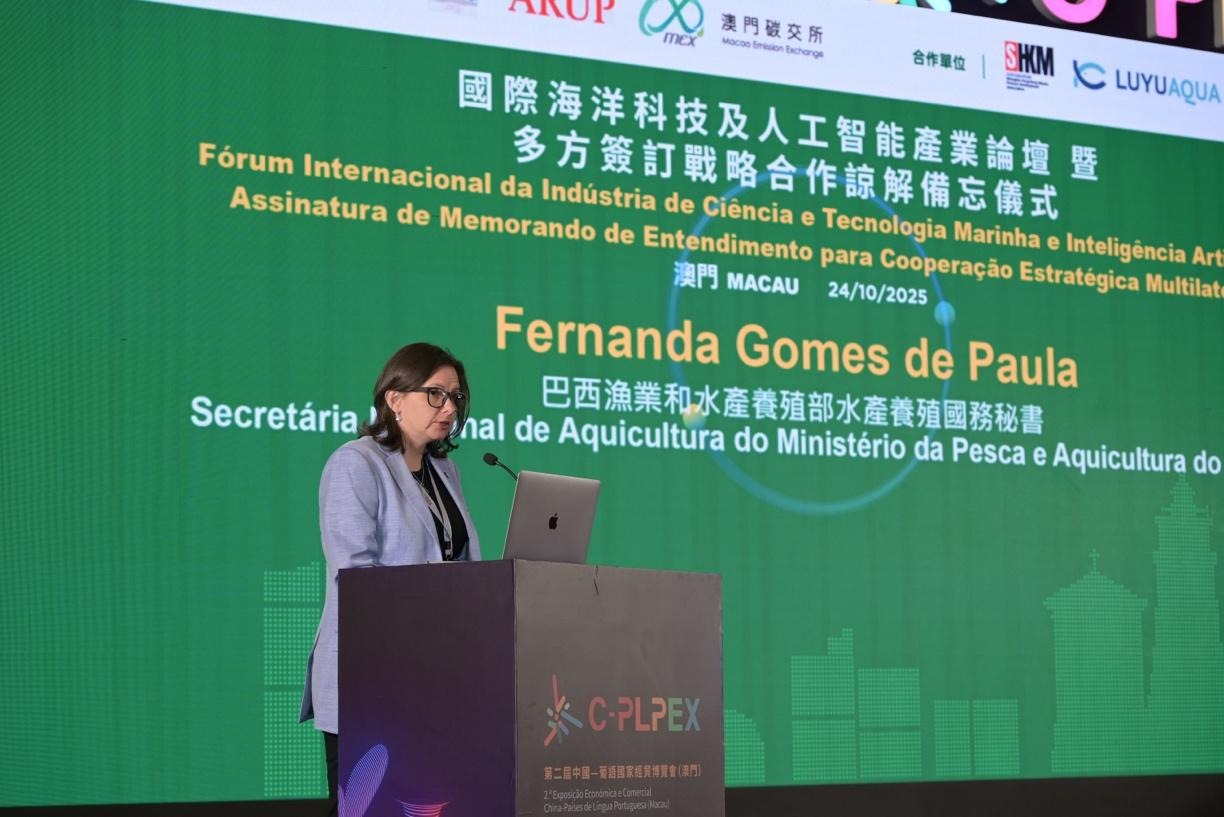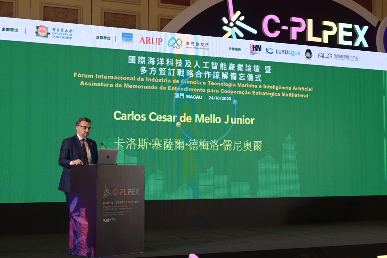 The “International Marine Technology and Artificial Intelligence Industry Forum,” supported by the Commerce and Investment Promotion Institute of Macau SAR and hosted by the University of Saint Joseph, was successfully held in Macao on October 24, 2025. With “AI + Ocean” as its core theme, the forum brought together government representatives, scholars, business leaders, and investors from China, Brazil and Portuguese-speaking countries and the Guangdong-Hong Kong-Macao Greater Bay Area. The event explored the integration and application of the latest developments in artificial intelligence, satellite technology, and the blue economy. The opening ceremony was officiated by Dra. Fernanda Gomes de Paula, Secretary of State for Aquaculture of Brazil; Dr. Carlos Mello, Special Advisor to the Minister of Fisheries and Aquaculture; Dr. Sam Li, Member of the Administrative Committee of the Commerce and Investment Promotion Institute of Macau SAR; Professor Alexandre Lobo, Vice Rector of the USJ; Mr. Terence Lee, President of the Sustainable Development Association; Mr. Philip Wong, Head of Business Strategy Development, ARUP East Asia; and Ms. Meng Meng, General Manager of the Macao International Carbon Emission Exchange (MEX).