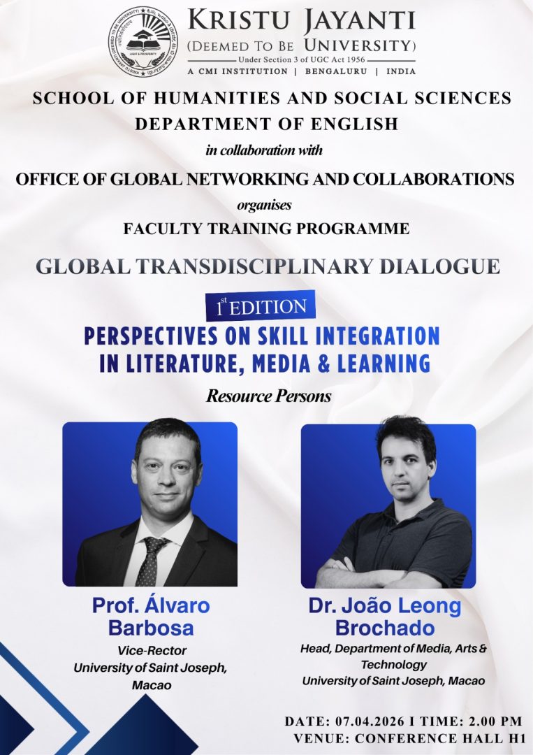 Alongside the main conference, Kristu Jayanti’s Department of English, in collaboration with its Office of Global Networking and Collaborations, hosted the first edition of the “Faculty Training Programme: Global Transdisciplinary Dialogue” under the theme “Perspectives on Skill Integration in Literature, Media & Learning”. Professor Barbosa and Dr. Leong Brochado served as resource persons for this initiative, sharing best practices in interdisciplinary pedagogy and skill-based learning models that bridge traditional academic disciplines with emerging media competencies.