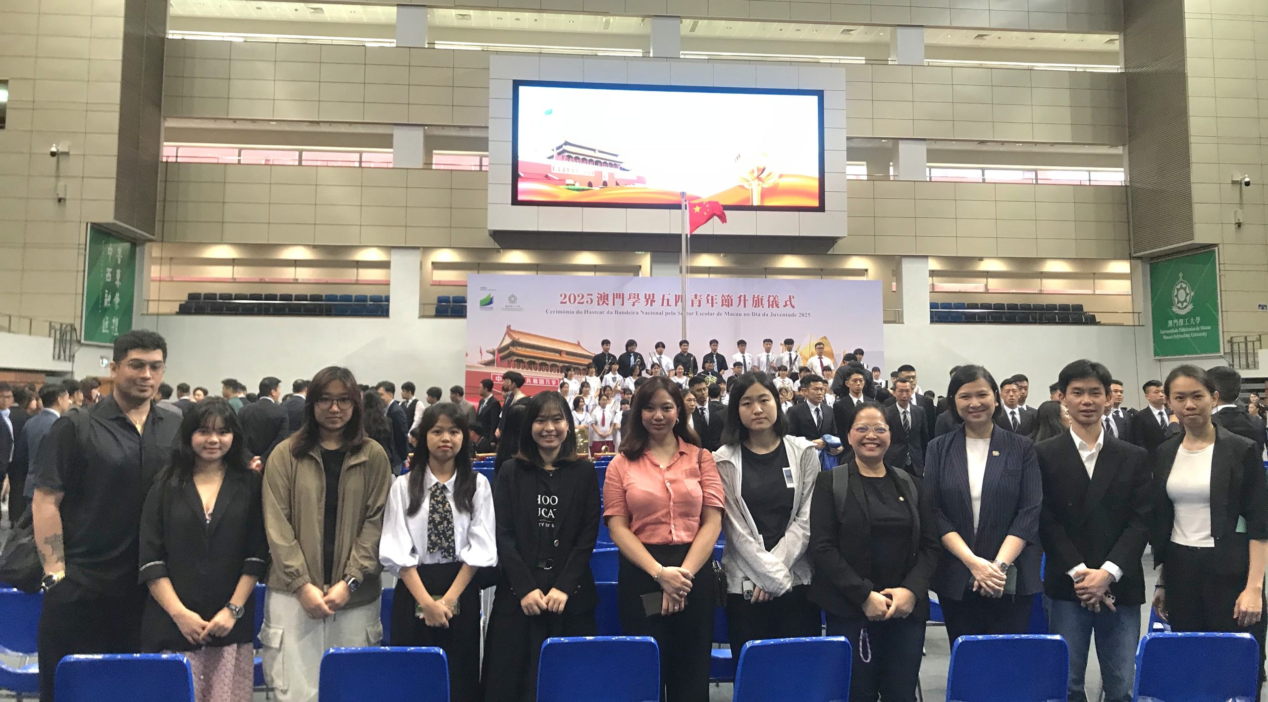 The flag-raising ceremony began at 8:30 a.m. at the Multi-Sport Pavilion of the Macao Polytechnic University. USJ representatives joined peers from across the territory. Dr. Teresa Loong, Vice Rector of USJ, and Ms. Lydia Tong, Senior Officer for Student and Alumni Affairs, led a delegation of students at the flag-raising ceremony. The ritual of raising the national flag served as both a historical tribute, reminding attendees of youth’s pivotal role in shaping societal progress.