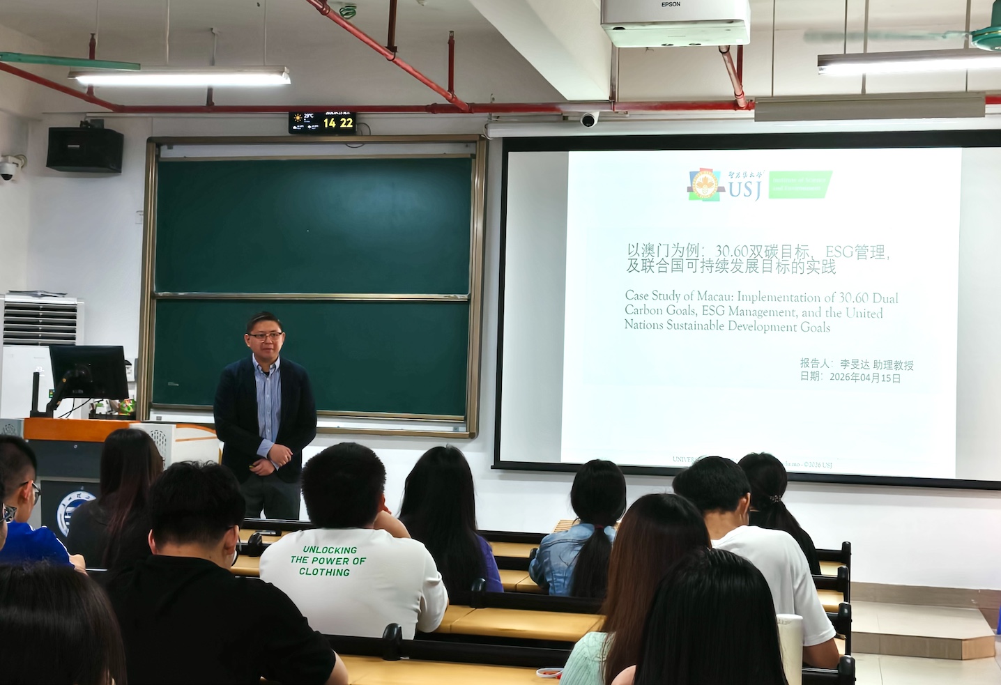A promotional talk of the USJ postgraduate programme and seminar talk titled “Case Study of Macau: Implementation of 30.60 Dual Carbon Goals, ESG Management, and the UN SDGs” was presented to a group of over 20 Bachelor students at GZIST.