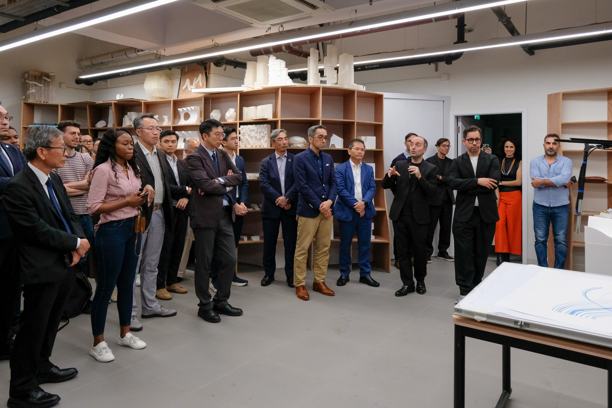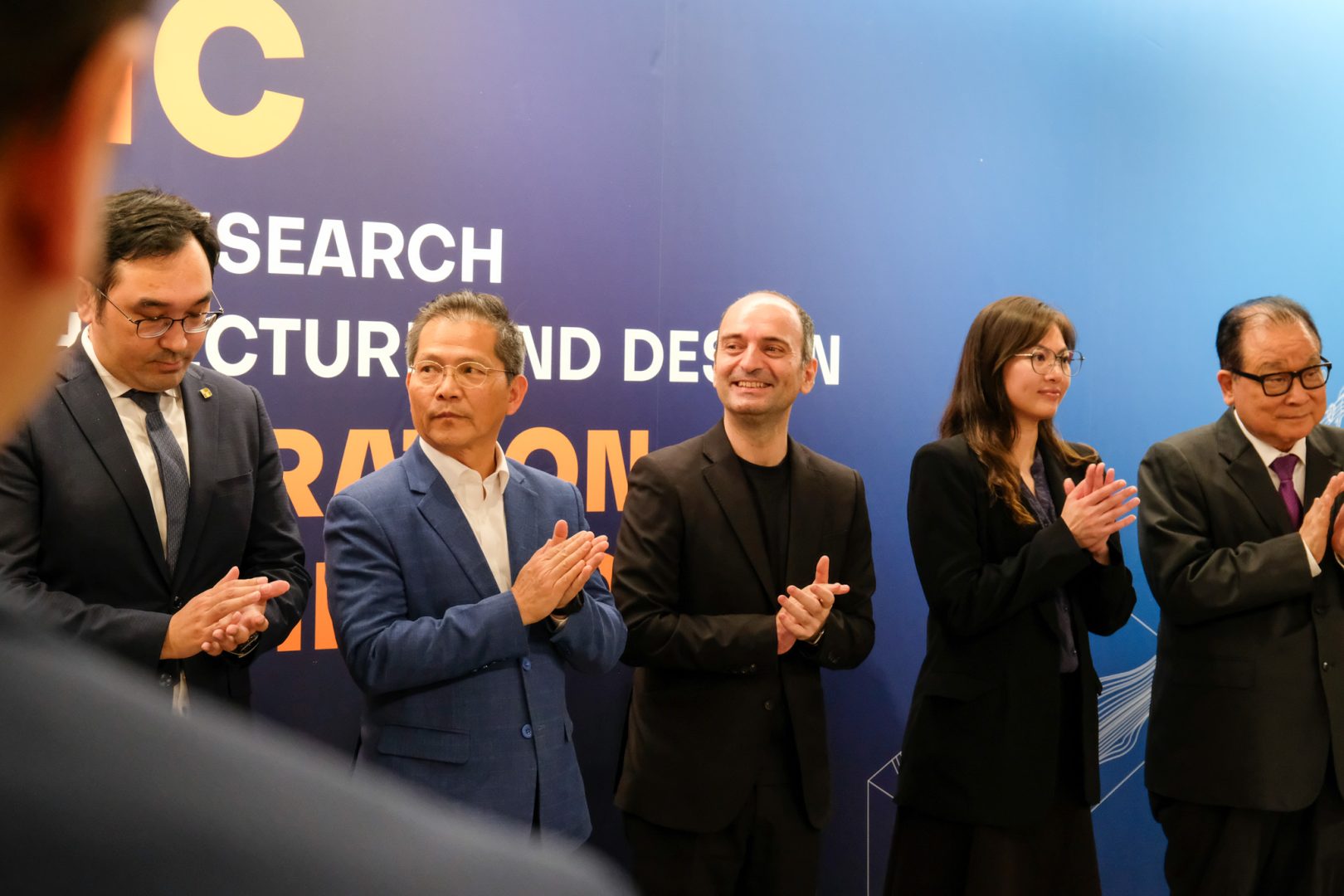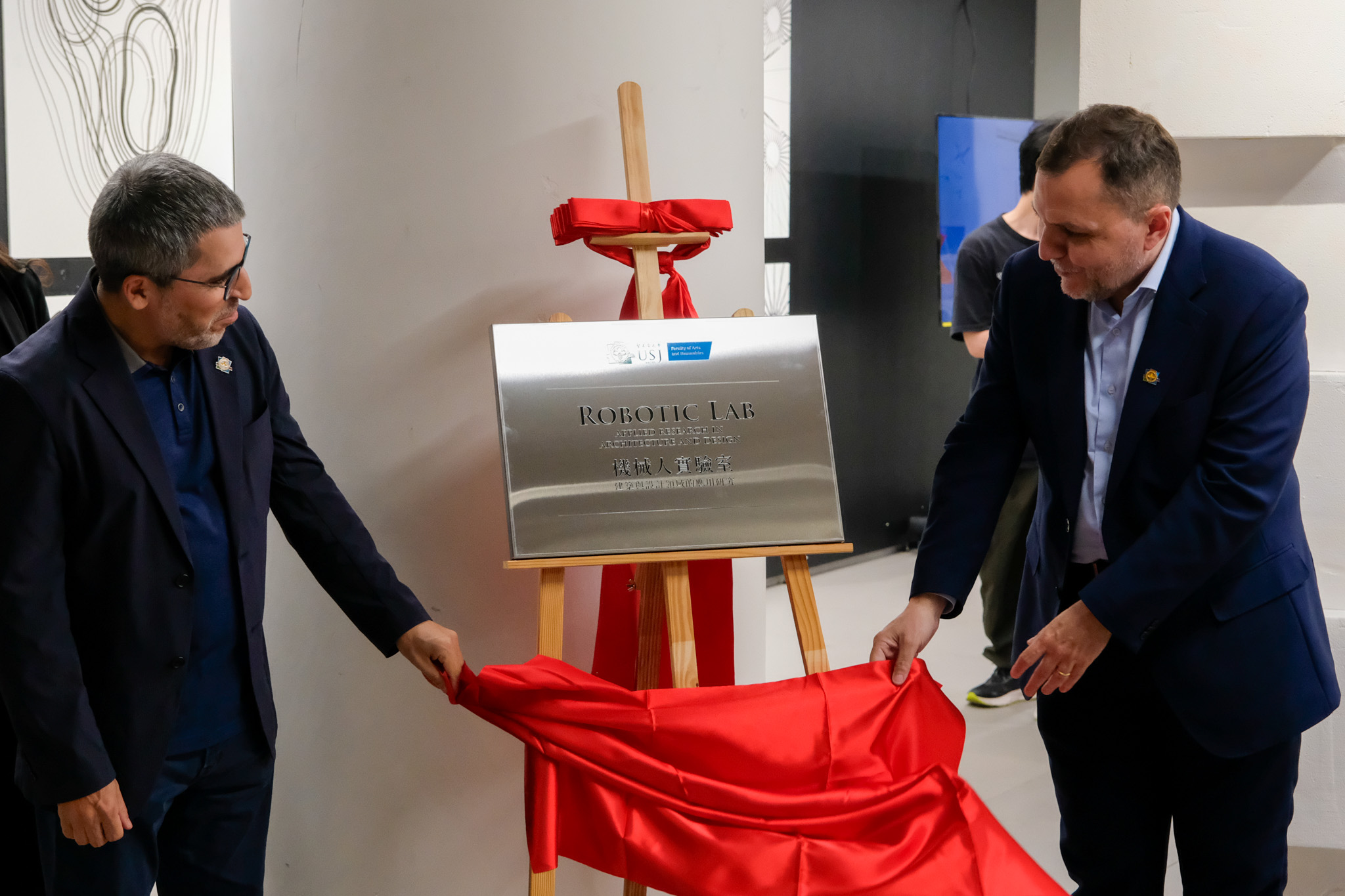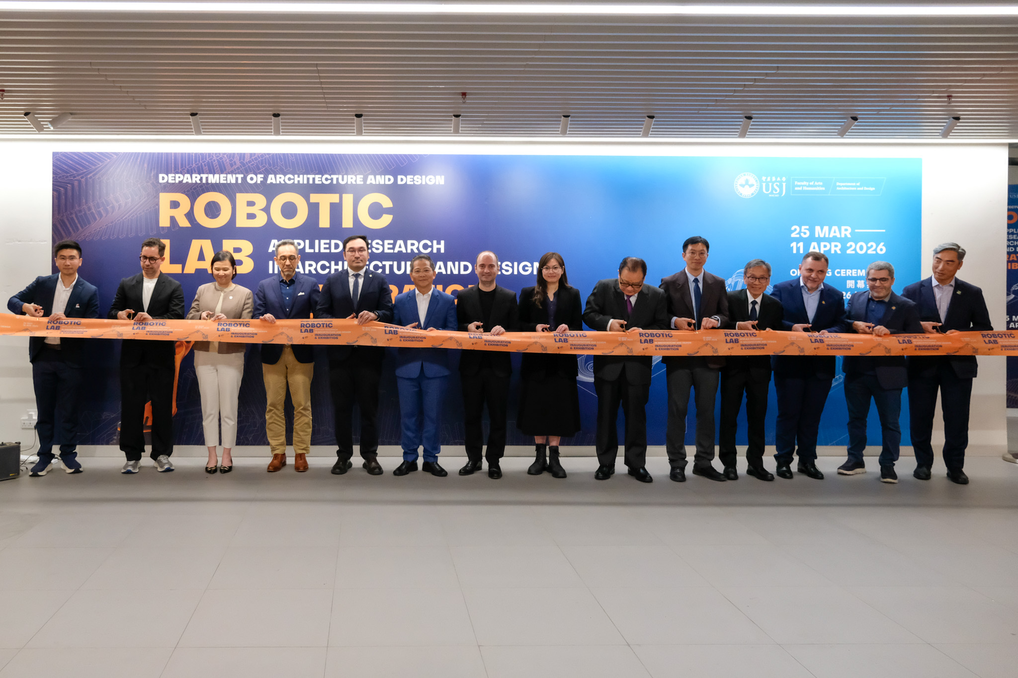 The inauguration ceremony was officiated by a distinguished group of guests including Mr. Iong Nin Fai, Head of the Technology Department at the Economic and Technological Development Bureau (DSEDT); Ms Tam Sio Wa, Head of the Division of Tertiary Educational Cooperation and Exchange at the Education and Youth Affairs Bureau (DSEDJ); Mr. Cheang Kun Wai, Member of the Administrative Committee of the Science and Technology Development Fund (FDCT); Mr. Ao Peng Kong, President of the Board of Directors of the Civil Engineering Laboratory of Macau (LECM); Mr. Luís Madeira de Carvalho, Deputy Director of the Public Works Bureau (DSOP); Mr. Sou Kin Meng, Head of the Department of Cultural Heritage at the Cultural Affairs Bureau (ICM); Mr. Benny Chan, President of the Hong Kong Institute of Urban Design; Mr. Ma Chi Fai, Director of the Macao Association of Building Contractors and Developers; Mr. Wong Hio Leong, Chairman of the Macau Construction Machinery Engineering Association (APMCCM); alongside USJ members including Dr. Teresa Loong, Vice-Rector for Student Life; Prof. Alexandre Lobo, Vice-Rector for Research and Innovation; Prof. Carlos Sena Caires, Dean of the Faculty of Arts and Humanities;  Prof. Nuno Soares, Head of the Department of Architecture and Design; and Prof. Filipe Afonso, Robotic Lab Director and Programme Supervisor for Bachelor of Architectural Studies.