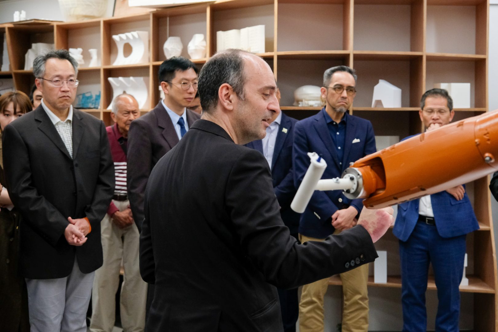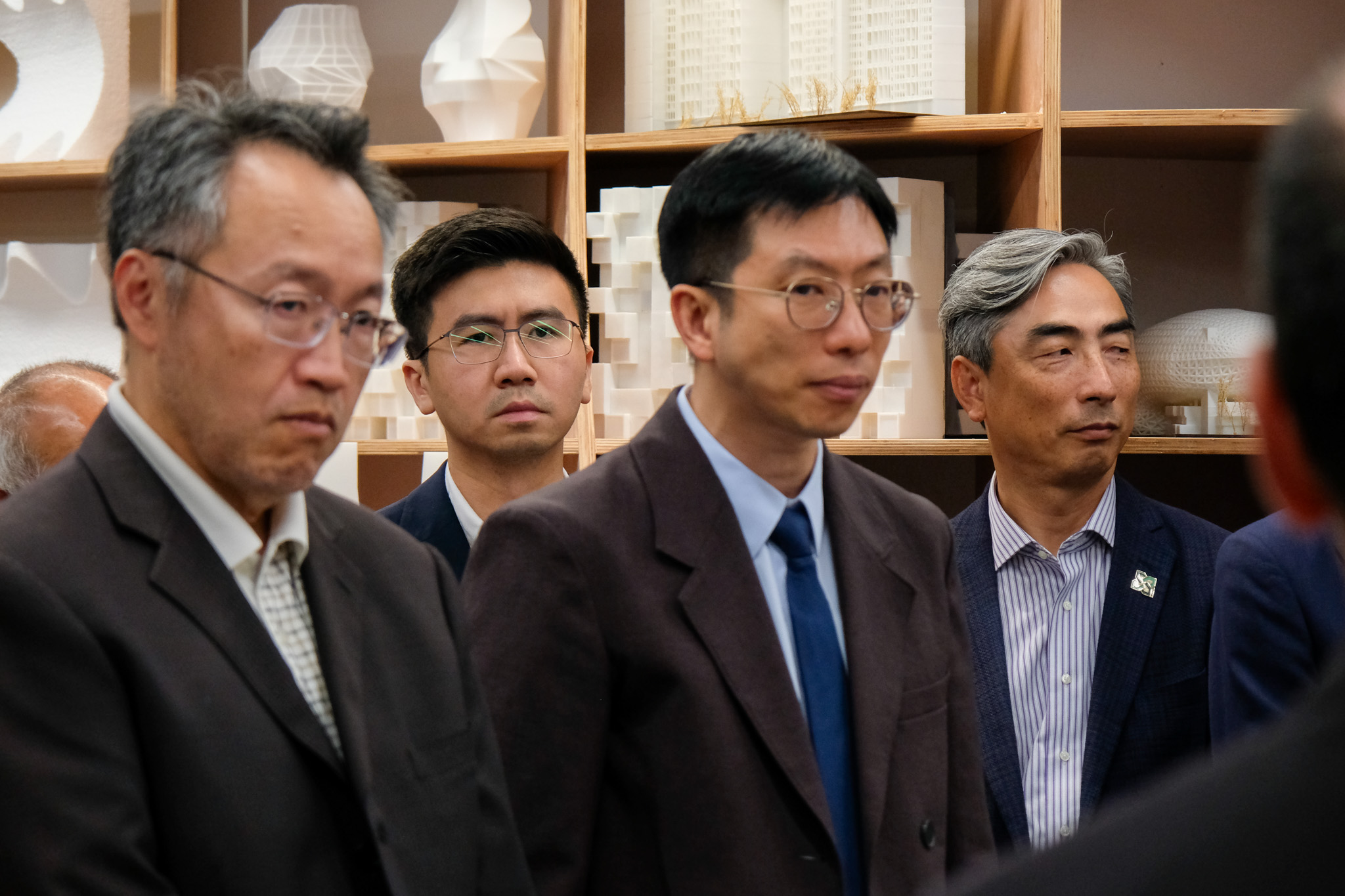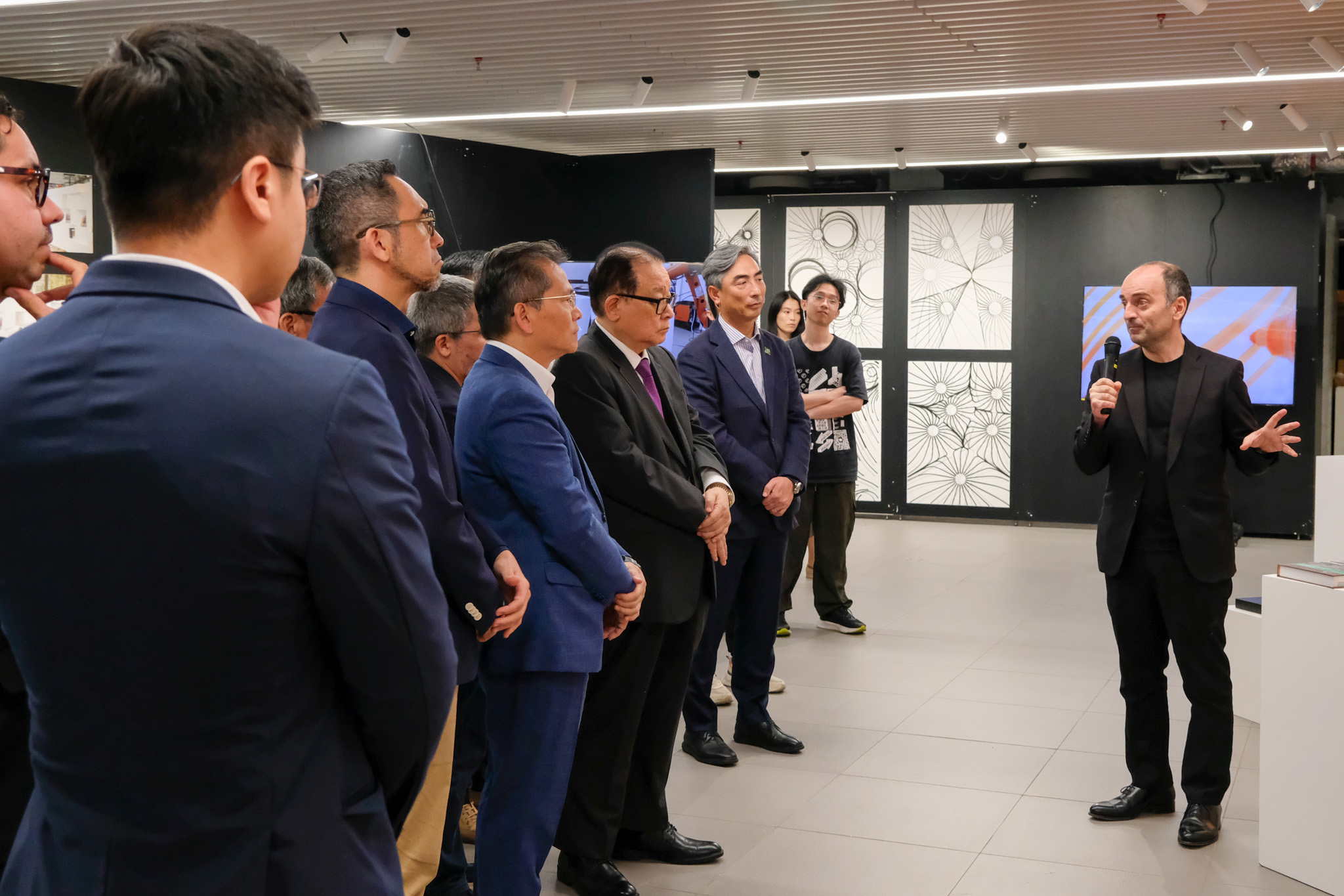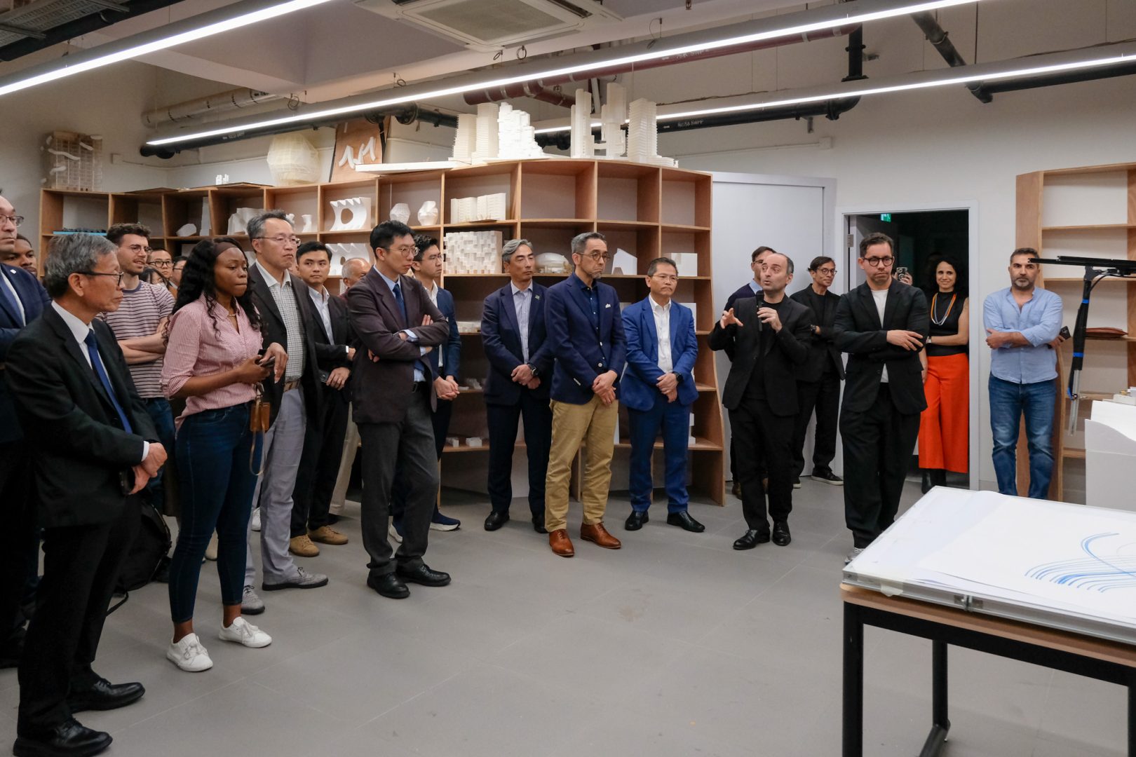 The inauguration ceremony was officiated by a distinguished group of guests including Mr. Iong Nin Fai, Head of the Technology Department at the Economic and Technological Development Bureau (DSEDT); Ms Tam Sio Wa, Head of the Division of Tertiary Educational Cooperation and Exchange at the Education and Youth Affairs Bureau (DSEDJ); Mr. Cheang Kun Wai, Member of the Administrative Committee of the Science and Technology Development Fund (FDCT); Mr. Ao Peng Kong, President of the Board of Directors of the Civil Engineering Laboratory of Macau (LECM); Mr. Luís Madeira de Carvalho, Deputy Director of the Public Works Bureau (DSOP); Mr. Sou Kin Meng, Head of the Department of Cultural Heritage at the Cultural Affairs Bureau (ICM); Mr. Benny Chan, President of the Hong Kong Institute of Urban Design; Mr. Ma Chi Fai, Director of the Macao Association of Building Contractors and Developers; Mr. Wong Hio Leong, Chairman of the Macau Construction Machinery Engineering Association (APMCCM); alongside USJ members including Dr. Teresa Loong, Vice-Rector for Student Life; Prof. Alexandre Lobo, Vice-Rector for Research and Innovation; Prof. Carlos Sena Caires, Dean of the Faculty of Arts and Humanities;  Prof. Nuno Soares, Head of the Department of Architecture and Design; and Prof. Filipe Afonso, Robotic Lab Director and Programme Supervisor for Bachelor of Architectural Studies.