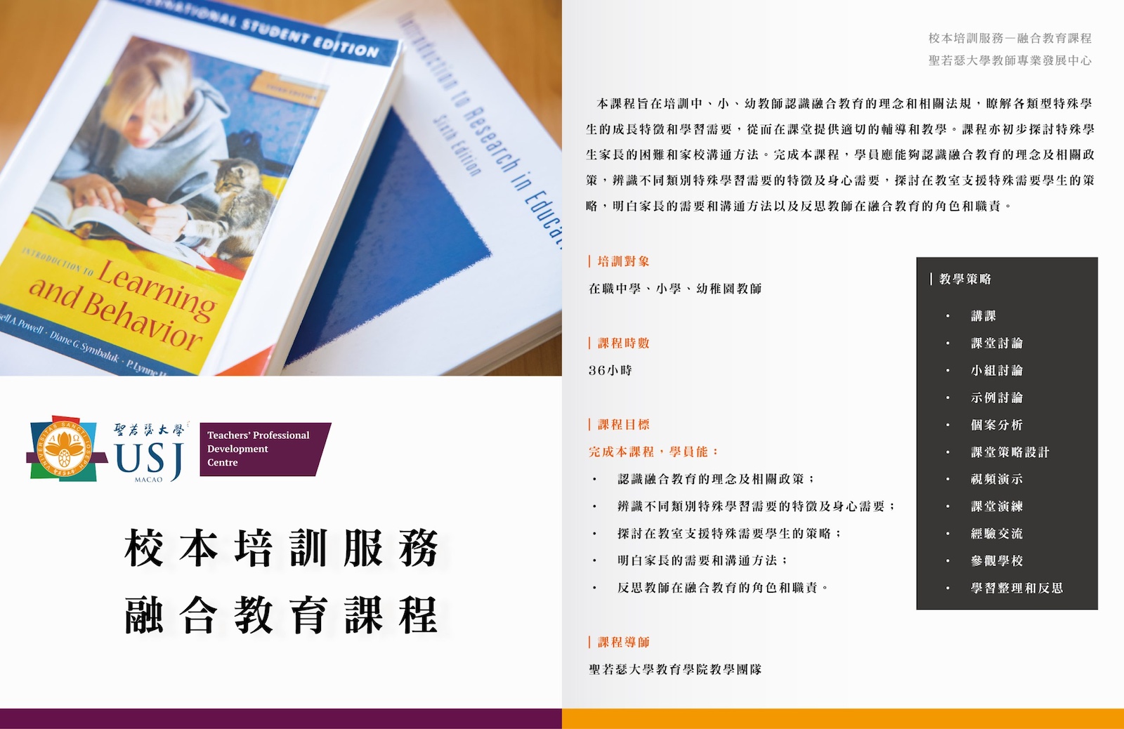 本課程旨在培訓中、小、幼教師認識融合教育的理念和相關法規,瞭解各類型特殊學生的成長特徵和學習需要,從而在課堂提供適切的輔導和教學。課程亦初步探討特殊學生家長的困難和家校溝通方法。完成本課程,學員應能夠認識融合教育的理念及相關政策,辨識不同類別特殊學習需要的特徵及身心需要,探討在教室支援特殊需要學生的策略,明白家長的需要和溝通方法以及反思教師在融合教育的角色和職責。