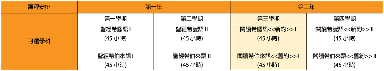 | 可選學科 | 聖經希臘語 III | 聖經希伯來語 III |