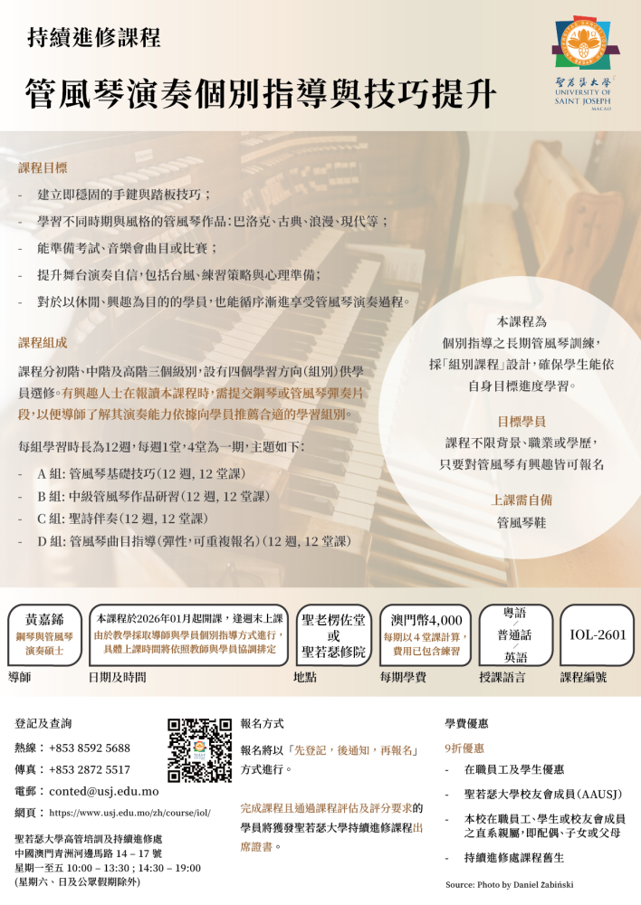 | 對象: | 課程不限背景、職業或學歷,只要對管風琴有興趣皆可報名