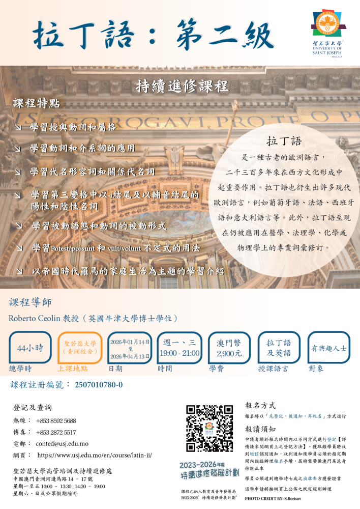 Lifelong Learning Office (LLO) is offering a course to students who are interested in studying Latin and have completed the Latin basic I course or 30 hours of Latin Language Learning.