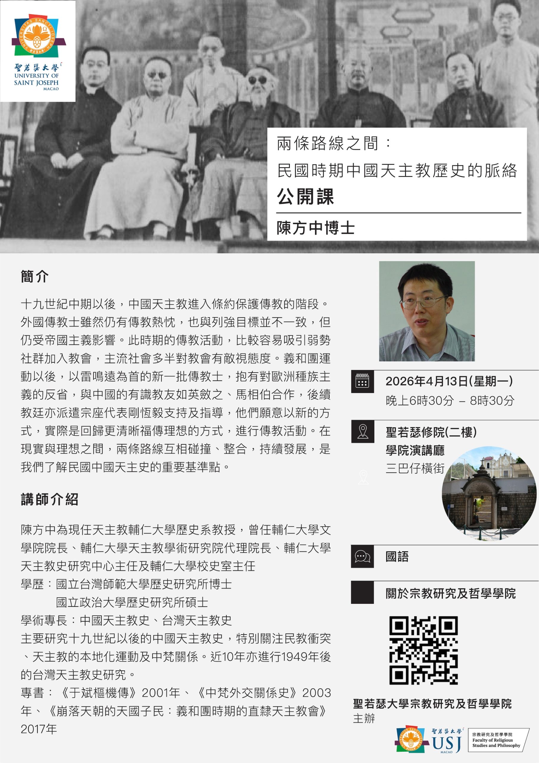 公開課”兩條路線之間:民國時期中國天主教歷史的脈絡”於4月13日(星期一)晚上6:30時至8:30時在聖若瑟大學宗教研究及哲學學院舉辦。