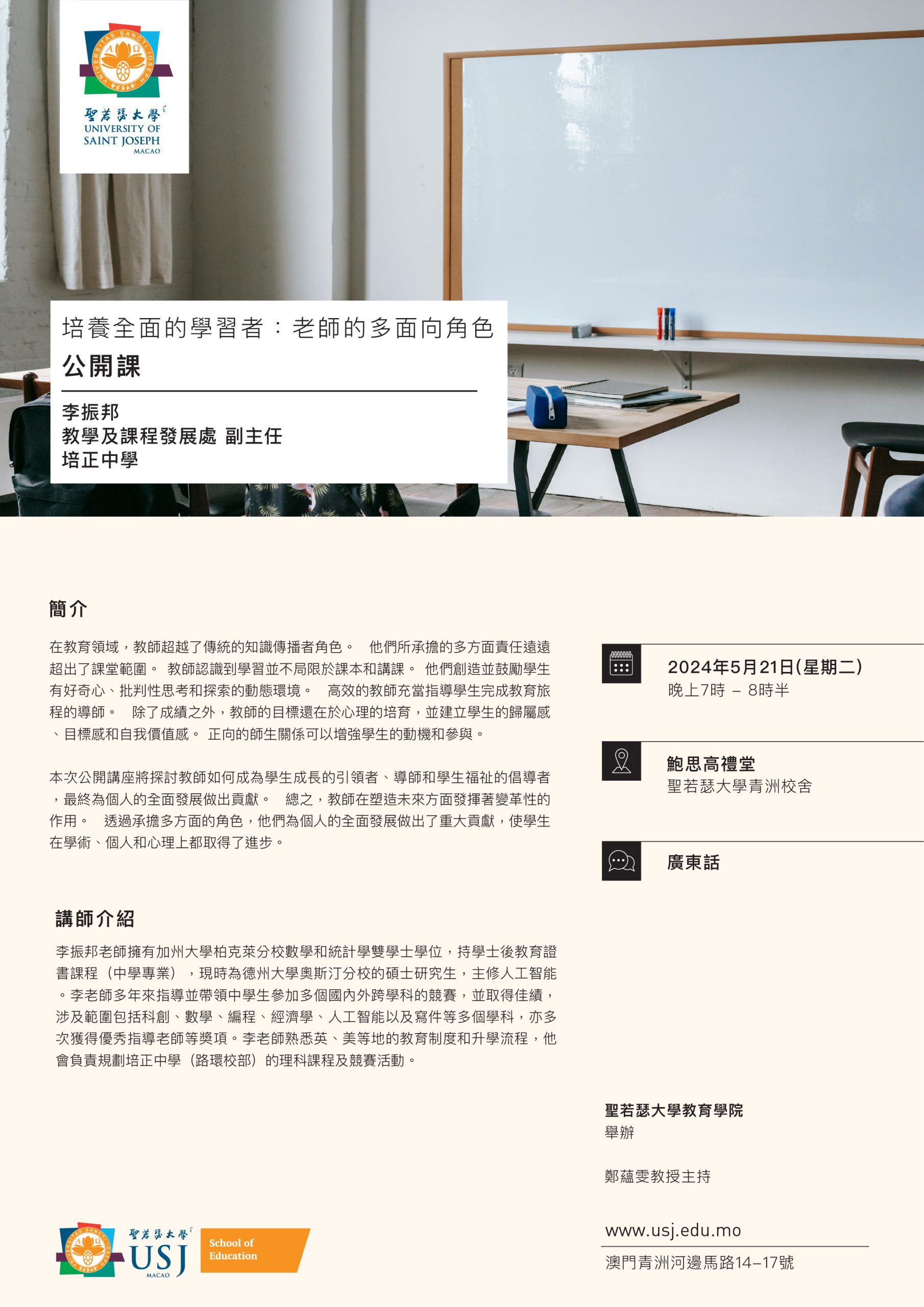聖若瑟大學教育學院於2024年5月21日在聖若瑟大學(青洲校舍)鮑思高禮堂舉辦「培養全面的學習者:老師的多面向角色」講座。