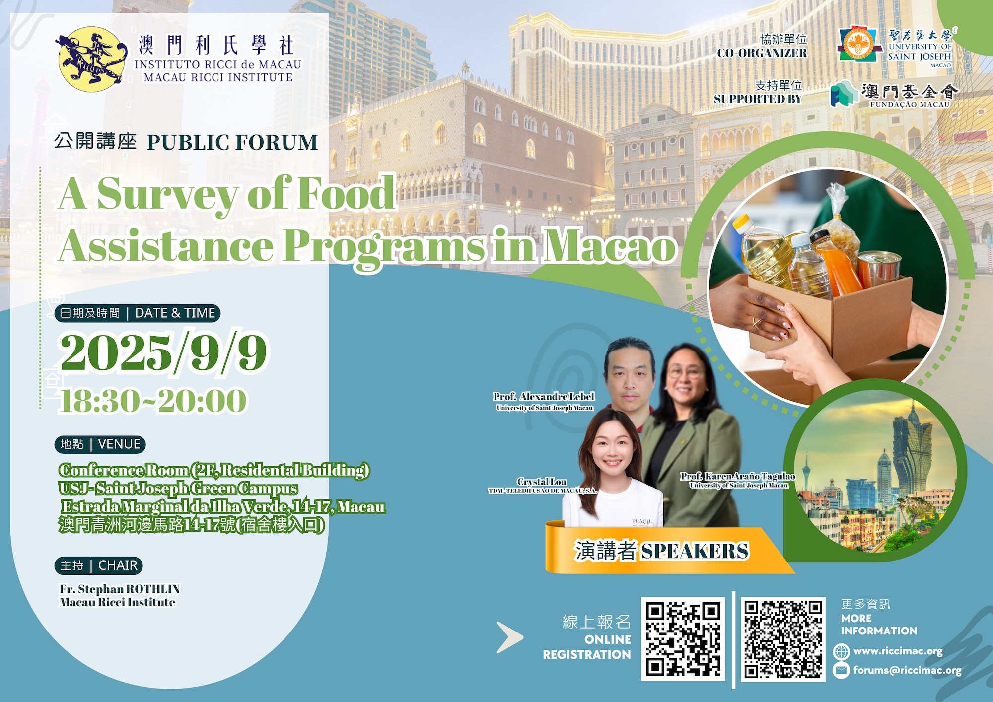 澳門利氏學社將於9月9日18:30至20:00,在聖大會議室舉辦「澳門食物援助計劃概覽」公開論壇。