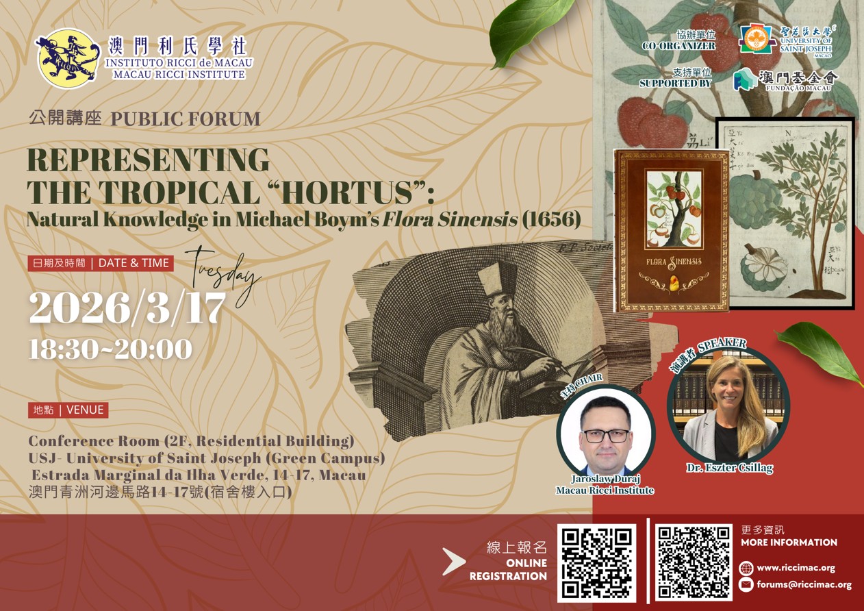澳門利氏學社於3月17日18:30至20:00舉辦公開講座“呈現熱帶 「園囿」:卜彌格《中國植物志》(1656)中的自然知識”。
