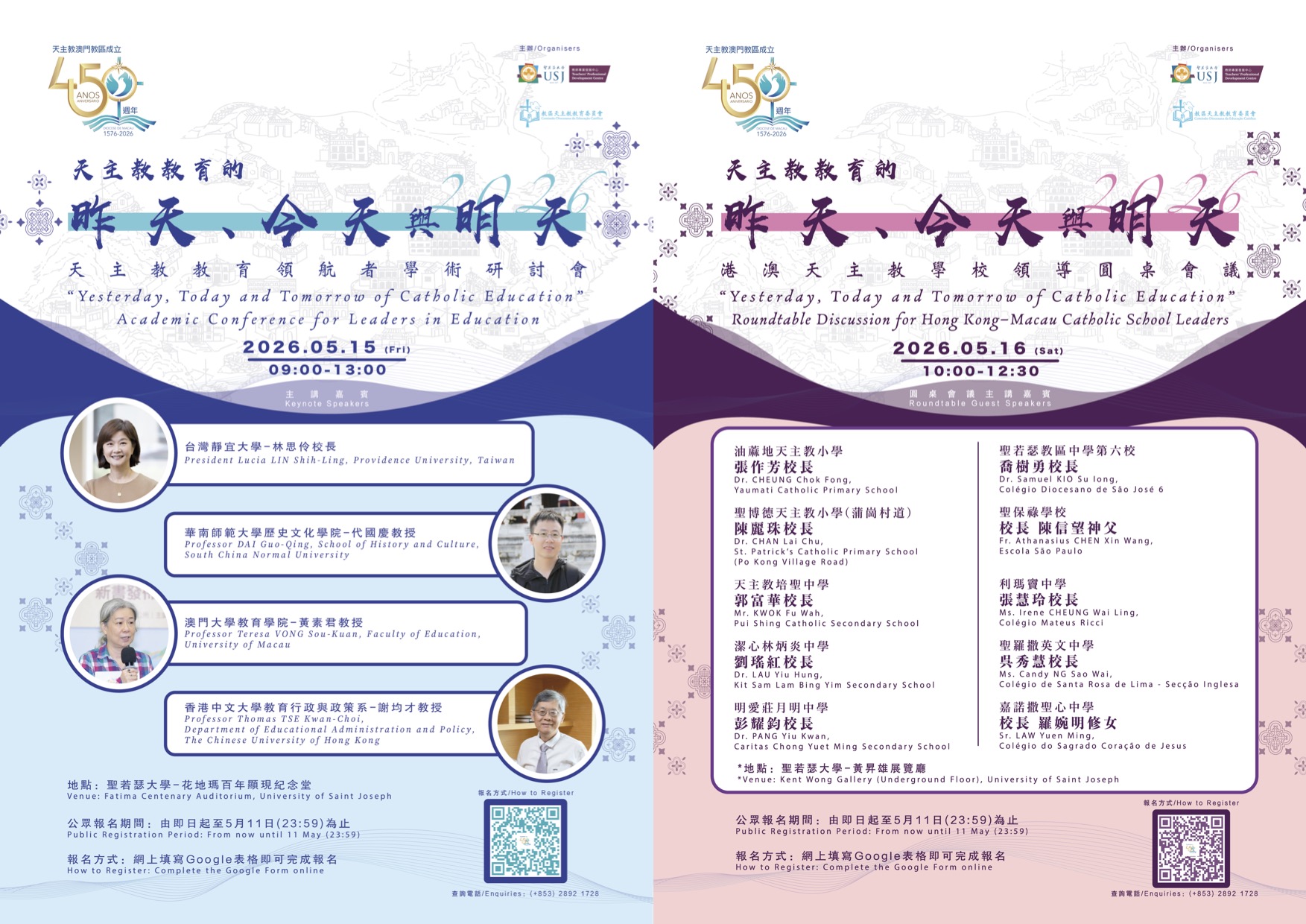 為紀念澳門教區成立450周年,教區天主教教育委員會聯同聖若瑟大學將於2026年5月15日(五)至16日(六)分別舉辦「天主教教育領航者學術研討會」及「港澳天主教學校領導圓桌會議」,並以「天主教教育的昨天、今天與明天」作主題。是次兩項活動旨在促進澳門與各地在學術及天主教教育議題之間的交流,共同探討教育使命的歷程、延續與創新。