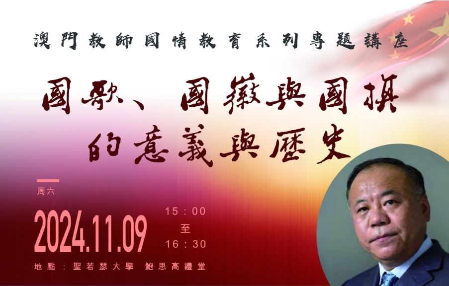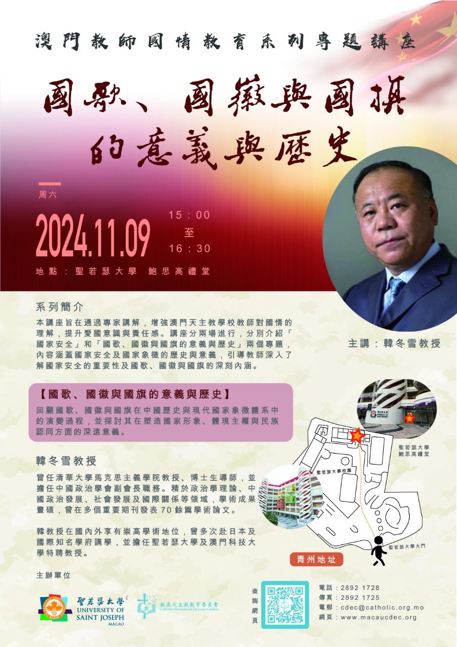 聖若瑟大學、教區天主教教育委員會於2024年11月9日在聖若瑟大學(青洲校舍)舉辦澳門教師國情教育系列專題講座:國歌、國徽與國旗的意義與歷史。