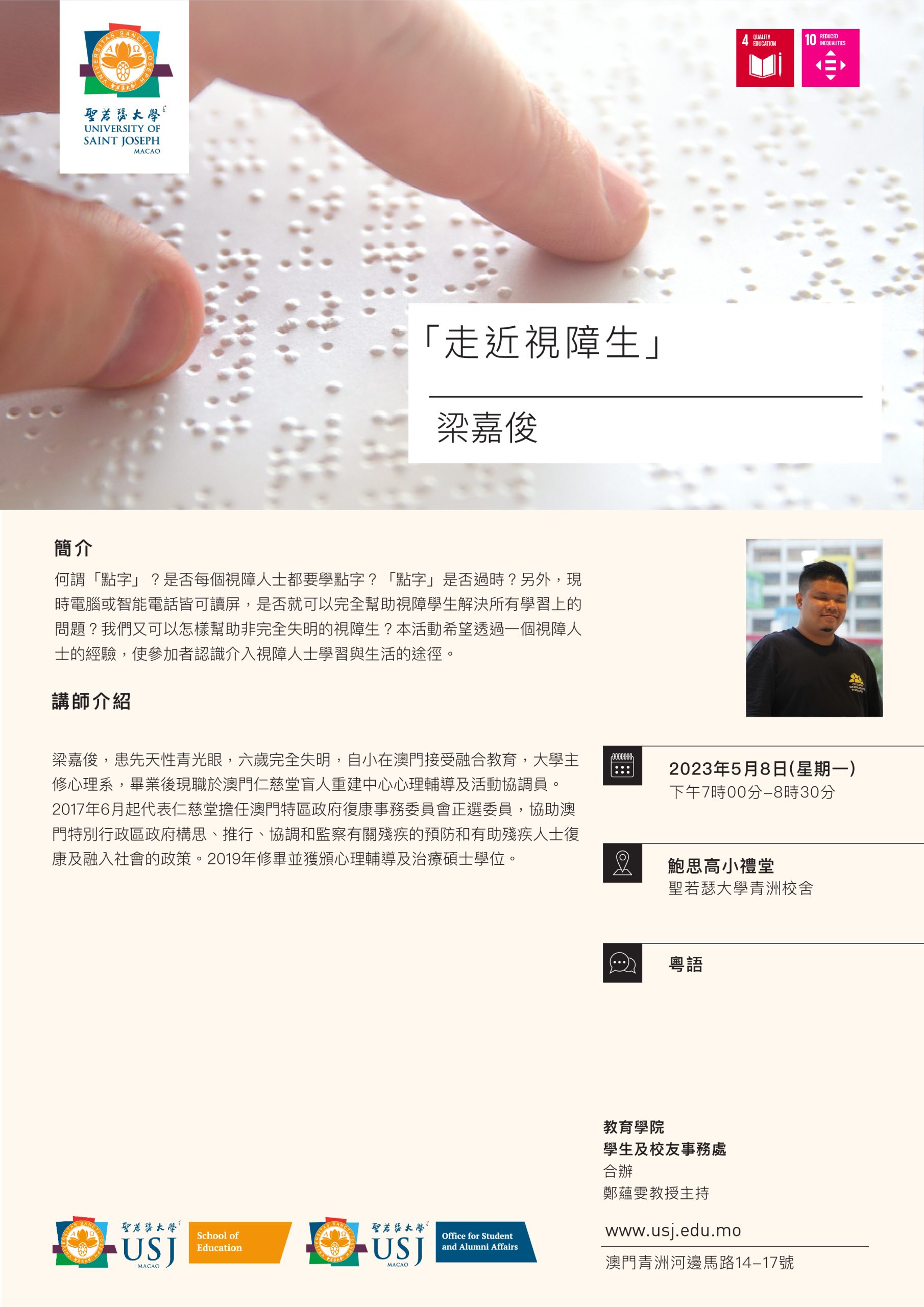 聖若瑟大學教育學院及學生及校友事務處將於2023年5月8日在聖若瑟大學(青洲校舍)鮑思高禮堂合辦“走近視障生”講座。