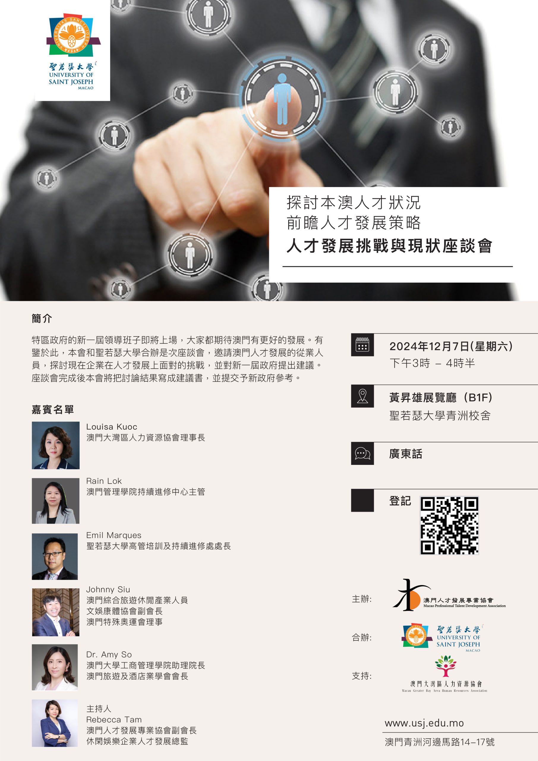 本會和聖若瑟大學合辦是次座談會,邀請澳門人才發展的從業人員,探討現在企業在人才發展上面對的挑戰,並對新一屆政府提出建議。
