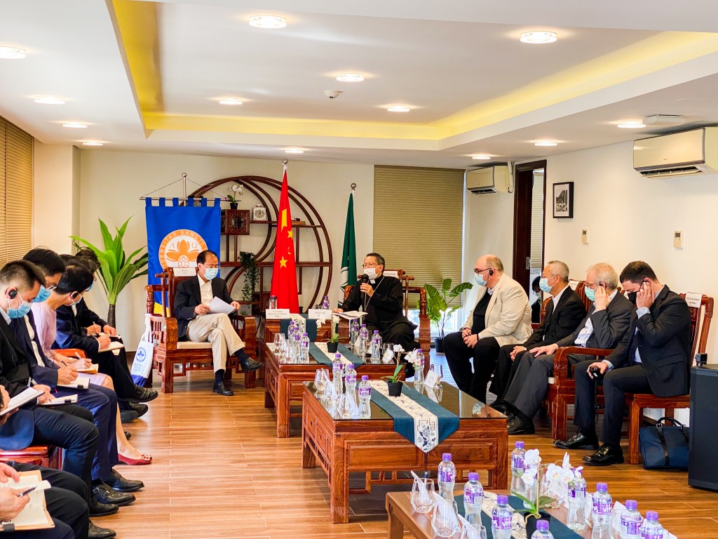 其後,與李校監、聖大管理層及教師代表進行了座談。李校監感謝中聯辦一直以來對聖大發展的支持和關心,並介紹了聖大在培養學生愛和德方面的價值取向。麥侍文校長在介紹聖大教育方針和發展目標時強調,“紮根中國澳門、立足中國澳門、服務中國澳門 (“USJ is in, of, and for Macau China”) 是大學的使命,為此,聖大將更好地配合特區政府高教策略,融合大灣區經濟發展,為國家“一帶一路”及“中葡經貿交流平台”發揮不可或缺的作用。麥校長還表示,聖大具有鮮明的體驗國際化教育及傳承葡萄牙語言及文化的獨特優勢,為此,聖大將在堅守及維持聖大傳統理念的同時,與時俱進,努力推行一系列新的教學優化和學術發展計劃,堅持教育和學術的卓越標準,促進與葡語系及歐洲國家的學術和文化交流,成為中西文化交融的一個重要學術平台,以服務於國家賦予澳門“打造以中華文化為主流、多元文化共存的交流合作基地”的使命。