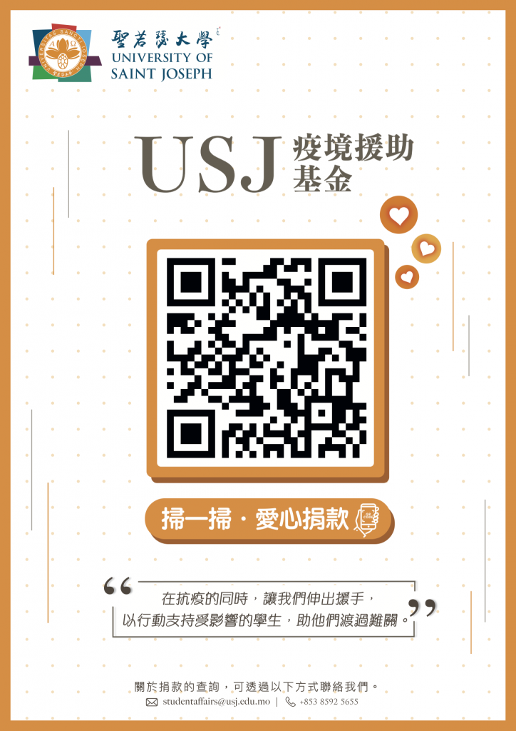 聖若瑟大學衷心感謝所有USJ 疫境援助基金的捐贈者,在抗疫的同時伸出援手,以行動支持受影響的學生,並助他們渡過難關。